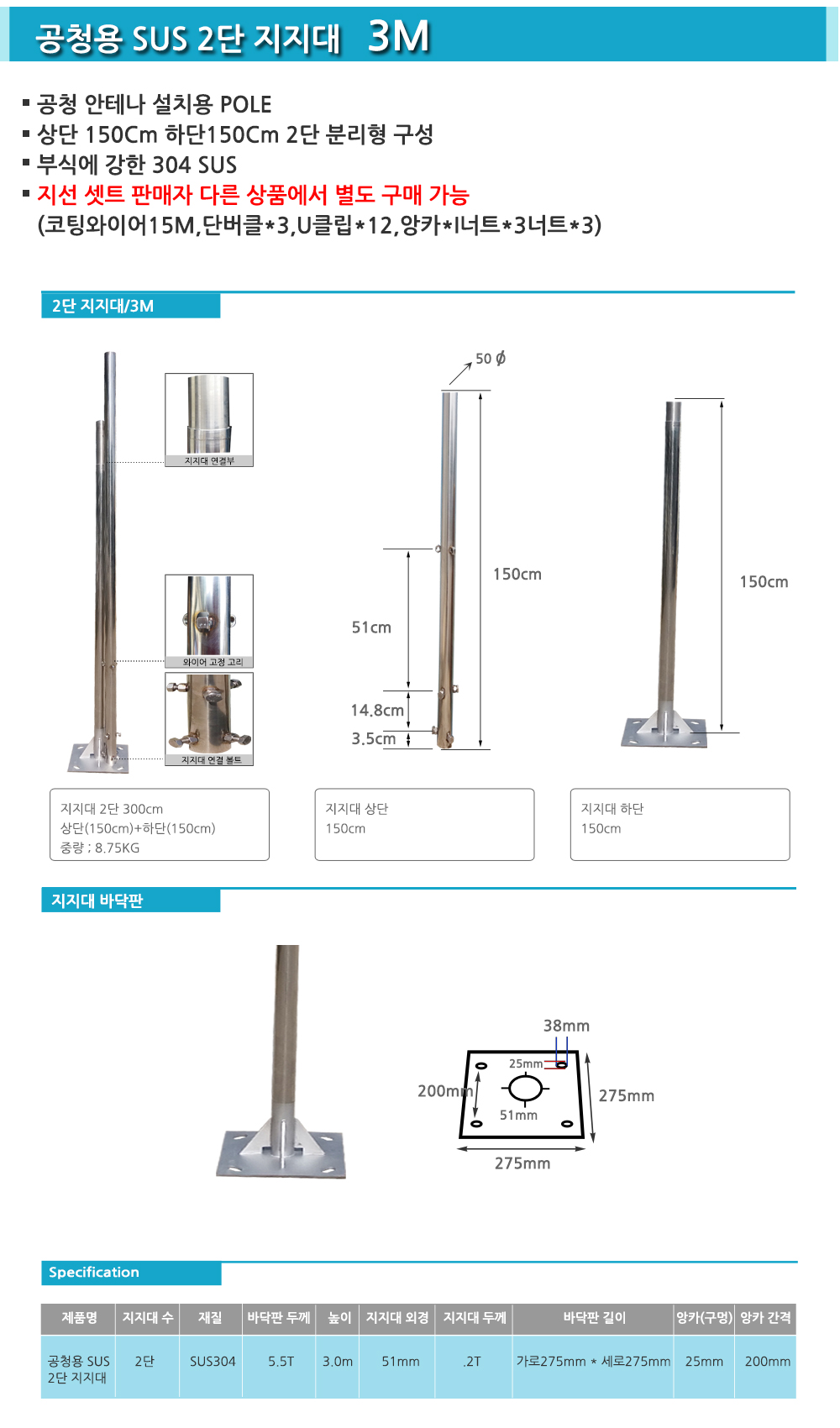 SUS pole,스텐레스폴대,공청용안테나스텐드,3M