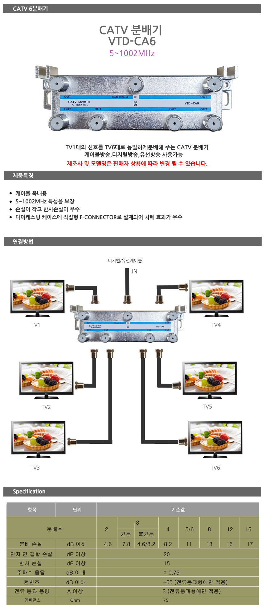 CATV6분배기,CATV분배기,5~1002MHz,유선,케이블